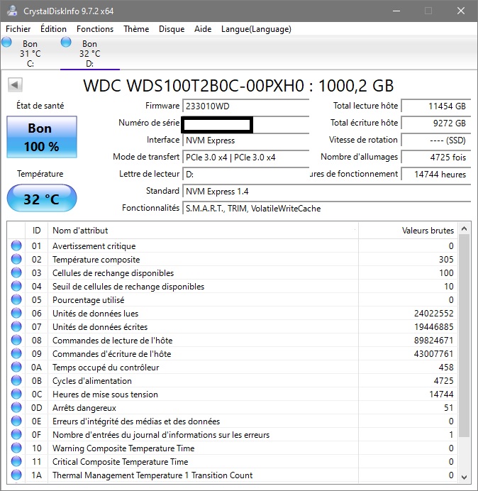 Sinon, il n’était pas visible dans le bios, ni dans la gestion des disques, ni dans le gestionnaire de périphériques, ni dans CrystalDiskInfo*. Pas d’avertissement d’aucune sorte dans le gestionnaire donc je ne pense pas que le souci venait du port M2.