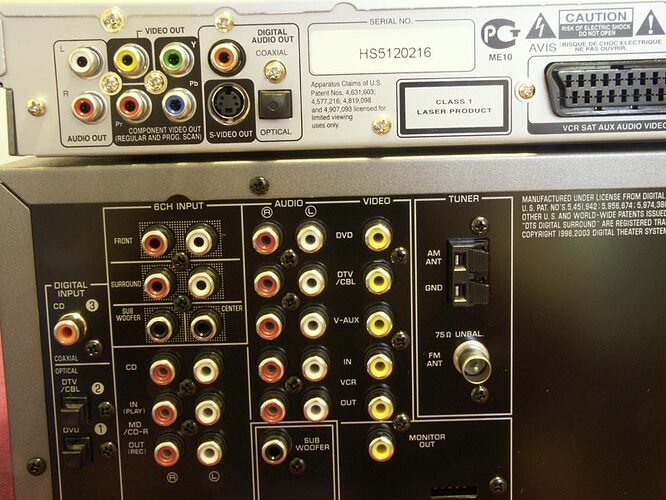 Je ne connais pas non plus trop l’intérêt de brancher le lecteur de DVD sur une entrée vidéo de l’ampli pour ressortir ensuite de l’ampli vers la TV (je crois que ça ne fait qu’augmenter les conversions vidéos, et ça ne me parait pas très bon).