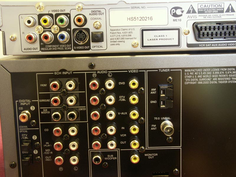 Voilà à quoi ressemble l’arrière du lecteur DVD (en haut) et de l’ampli :