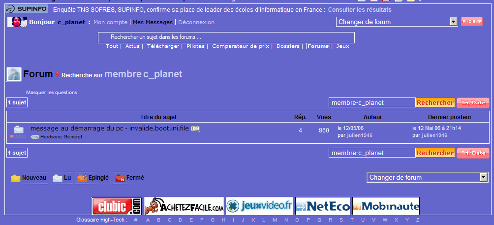ah wais … « mes derniers messages » ça déconne à fond, j’ai plus droit qu’à une liste de « 1 » message de mai 2006 :sarcastic: