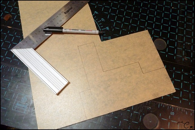 Réalisation d’un cache partiel pour la carte-mère. Ici prise des mesures et essais avec une feuille de papier :