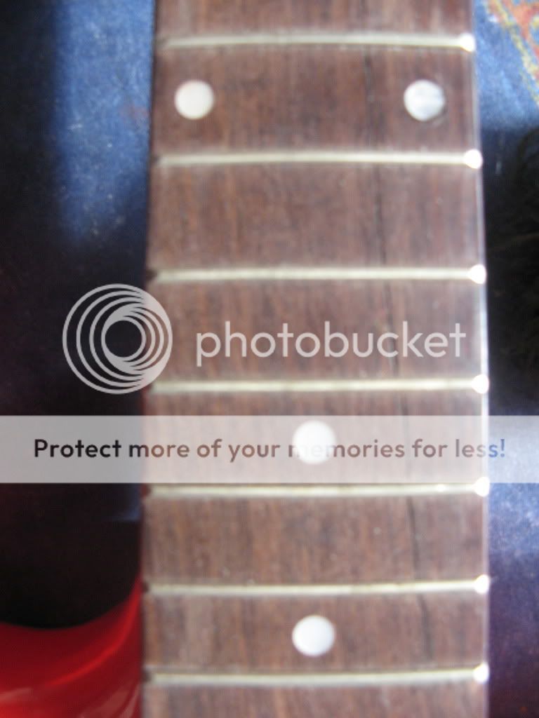 Celle-là est neuve, achetée en VPC (chez Woodbrass), mais en fait ça ne touche pas la frette, c’est moi qui débloque, c’est juste que comme elle est montée en extra light la corde va toucher sa voisine quand j’attaque trop fort :o (faut dire, ce WE si j’ai eu l’occasion de me mettre une demi-heure dessus c’est le maxi :paf: )