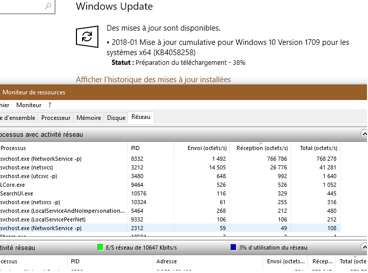 ici rangé par truc qui télécharge le plus « Réception », pendant un téléchargement de windows update à ma demande