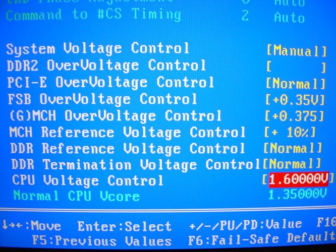 Je vois pas ce qui peut merdé… à 3.4ghz (425x8) la Vddr +0.05 v , Vfsb +0.05 v , Vmch +0.025 v et Vcore 1.37500 v , ça passe OCCT 1h , et à 3.6 ghz ( 450x8) j’ai essaiée en augmentant tout de 0.05 => ca merde , puis tout en 0.1 => je n arrive meme pas à la barre de chargement , et j’ai été jusque 1.5000 de vcore… je vois vraiment ce que je fais de mal , ma mémoire est a 900 mhz en 5-5-5-15 mais je sais pas jusqua cb je peux l’augmenter sachant qu’elle est testé en 5-5-5-15 -1066 mhz à 2.3 v - 2.4 v