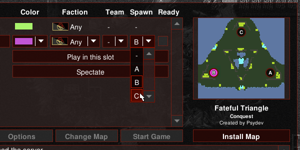 - L’admin peut maintenant choisir certaines options de début de partie : avec quelles unités commencer, combien d’argent, permettre d’installer sa base près d’un coéquipier, afficher ou non le voile et/ou le brouillard de guerre.