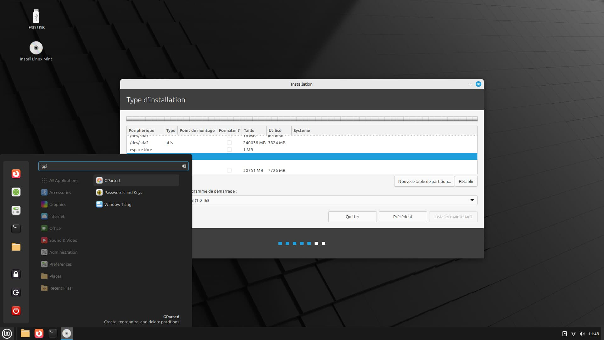 L’installeur est en fond, j’utilise touche windows + Gpa pour trouver gparted directement