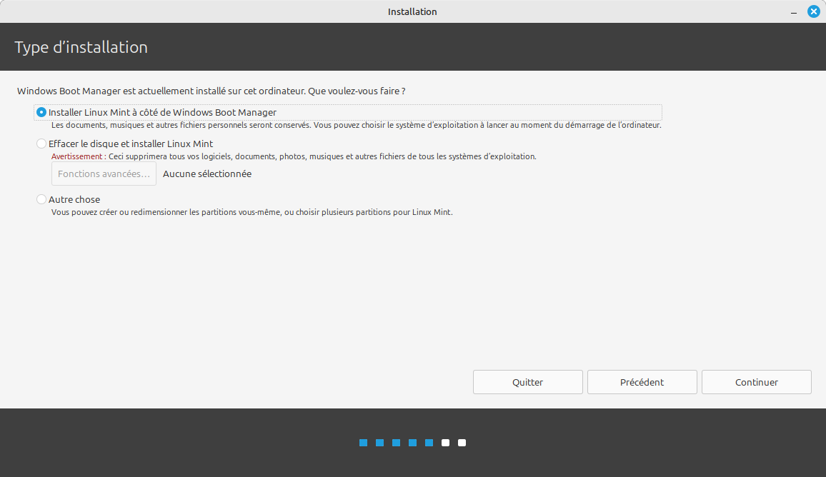 La phase critique pendant l’installation c’est le choix de l’endroit sur lequel linux doit s’installer. Même plutôt les options de choix sur l’ecran juste d’avant parmi lesquels il y a un beau « je supprime tout et je prends mes aises? »)