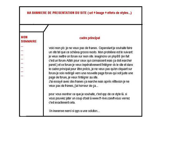 voici mon pb: je ne veux pas de frames. Cependant je souhaite faire un site tel que ce schéma grosso modo. Mon problème est le suivant: je veux mettre un forum sur mon site. imaginons un phpBB (en fait c’est un forum Aztek pour ceux qui connaissent mais ça doit marcher pareil.) et ce forum je veux impérativement l’intégrer ds le site et dans le cadre principal pour être précis, je ne veux pas qu’en cliquant sur forum je sois redirigé vers une nouvelle page forum qui soit juste une page de forum, je veux l’intégrer au site.