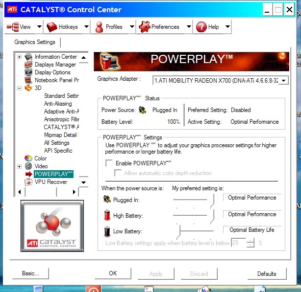 Dans le menu de gestion de l’alim de Vista, dans le menu dédié à ATI, les paramètres batteries et secteurs sont inexistants…