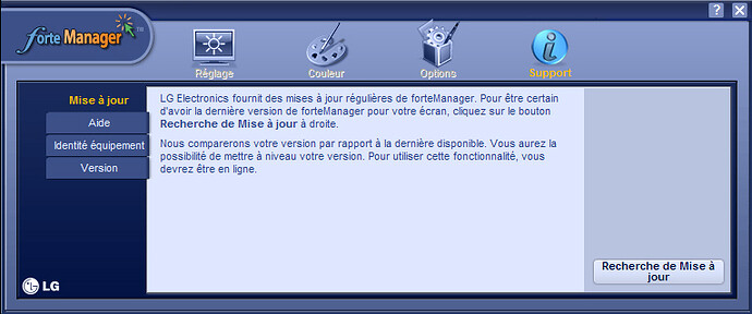 Bonjour a tous, je possède un écran LG L226WTQ et je viens de changer de configuration matériel. Le logiciel Forte manager apparait, mais avec toutes les options grisés sauf longlet « support », en gros je ne peux plus rien modifier à laide de ce logiciel. Sur mon ancienne configuration je navais aucun soucis, avez-vous déjà eu ce problème et comment faire pour le résoudre ?