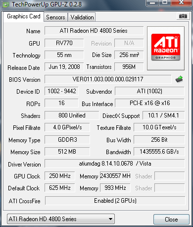 D’un point de vue gaming, toujours les mêmes problèmes, je vous donne l’exemple avec Crysis ; en baissant sa résolution en 800x600 en config « bas », le jeu rame, je dois tourner aux alentours de 10 FPS et encore, je suis généreux, alors qu’avec une seule HD4850 je le fais tourner en 1920x1200 en « Élevé » avec un minimum de 25-30FPS…