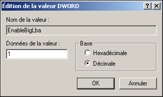 J’ai donc cherché la solution qui était souvent d’aller dans « executer », mettre « regedit.exe » etc… jusqu’à « EnableBigLda »