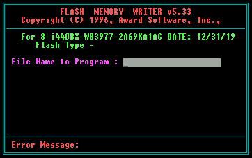 Une fois sous dos, insérez la disquette ou le cd (ou clef USB il me semble) contenant les fichiers du nouveau BIOS et exécutez le programme de flash (awdflash.exe) : la ligne de commande sera alors