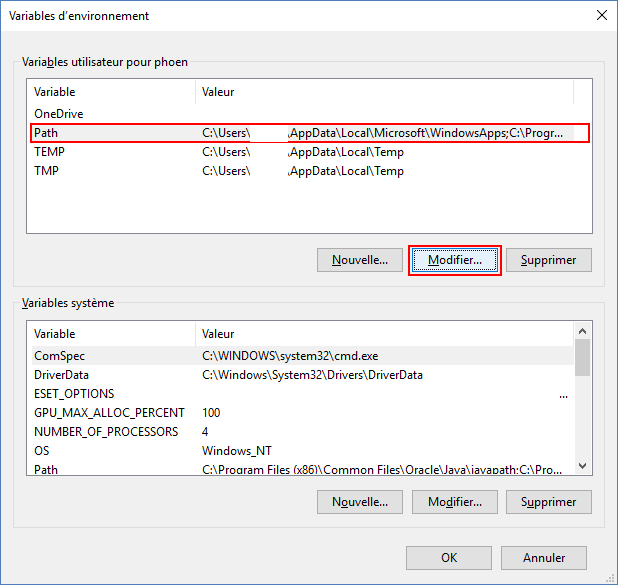 Dans le premier cadre, j’ai souligné la ligne « Path » (encadrée en rouge), puis cliqué sur « Modifier » (en rouge également).