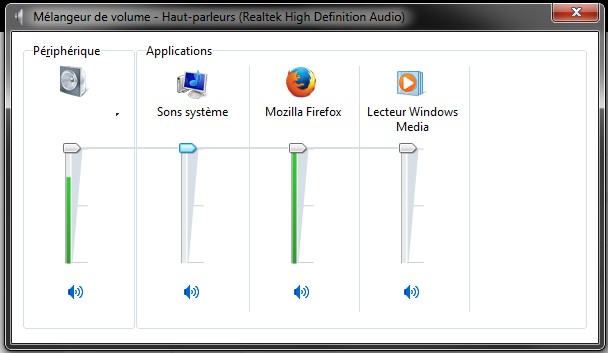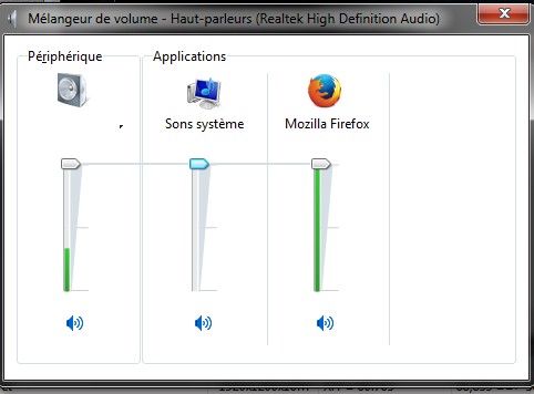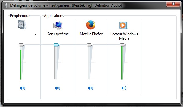 Tout les mélangeurs sont à 100%. Et pourtant quand j’écoute de la musique, prenons exemple de youtube qui est le cas le plus prononcé: les curseurs sont à 100%, le niveau de la musique (la barre verte) monte bien à 100% sur le mélangeur Firefox, mais pour le son général, elle monte à environ 50% maxi. (Pour WMP c’est plutôt ~85-90%)