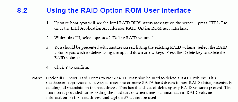 Réinitialisation disque dur à la non-raid peut également être utilisé pour supprimer un raid volume. Ce mécanisme est prévu comme un moyen de réinitialiser un ou plusieurs disque dur sata à la non-raid statut, essentiellement en supprimant toutes les métadonnées sur les disques durs. Cela a pour effet de supprimer tout raid volumes présents. Cette fonction est fournie pour re-fixer le disque dur quand il un décalage dans le raid volume d’informations sur les disques durs, et l’option 2 ne peut pas utilisé.