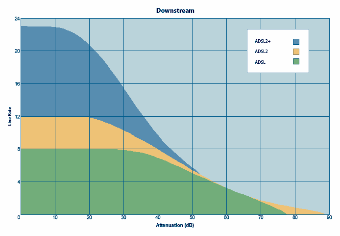 a + de 6km du dslam on est au dessus de 60dB d’attenuation et donc on passe en dessous de tes 256ko/s