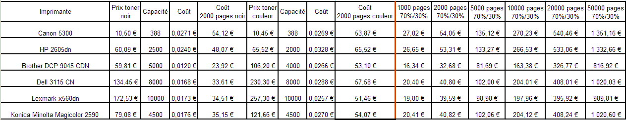 Un peu moyen mon calcul…mais on voit de suite que la HP 2605dn que j’ai actuellement n’est pas plus économique que notre Canon IP5300 à jet d’encre. Par contre, la Brother est de suite bien plus économique.