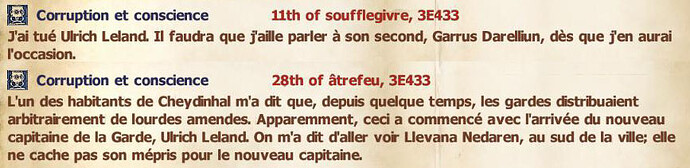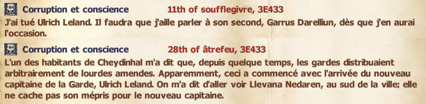 En vous baladant en ville et en causant avec les gens des rumeurs, vous apprenez que le Capitaine de la Garde de Cheydinhal, Ulrich Leland, extorque de grosses sommes aux habitants par le biais d’amendes toujours plus lourdes. On vous dirige vers Llevana Nedaren, une elfe noire qui est à peu près la seule à s’opposer à Leland.