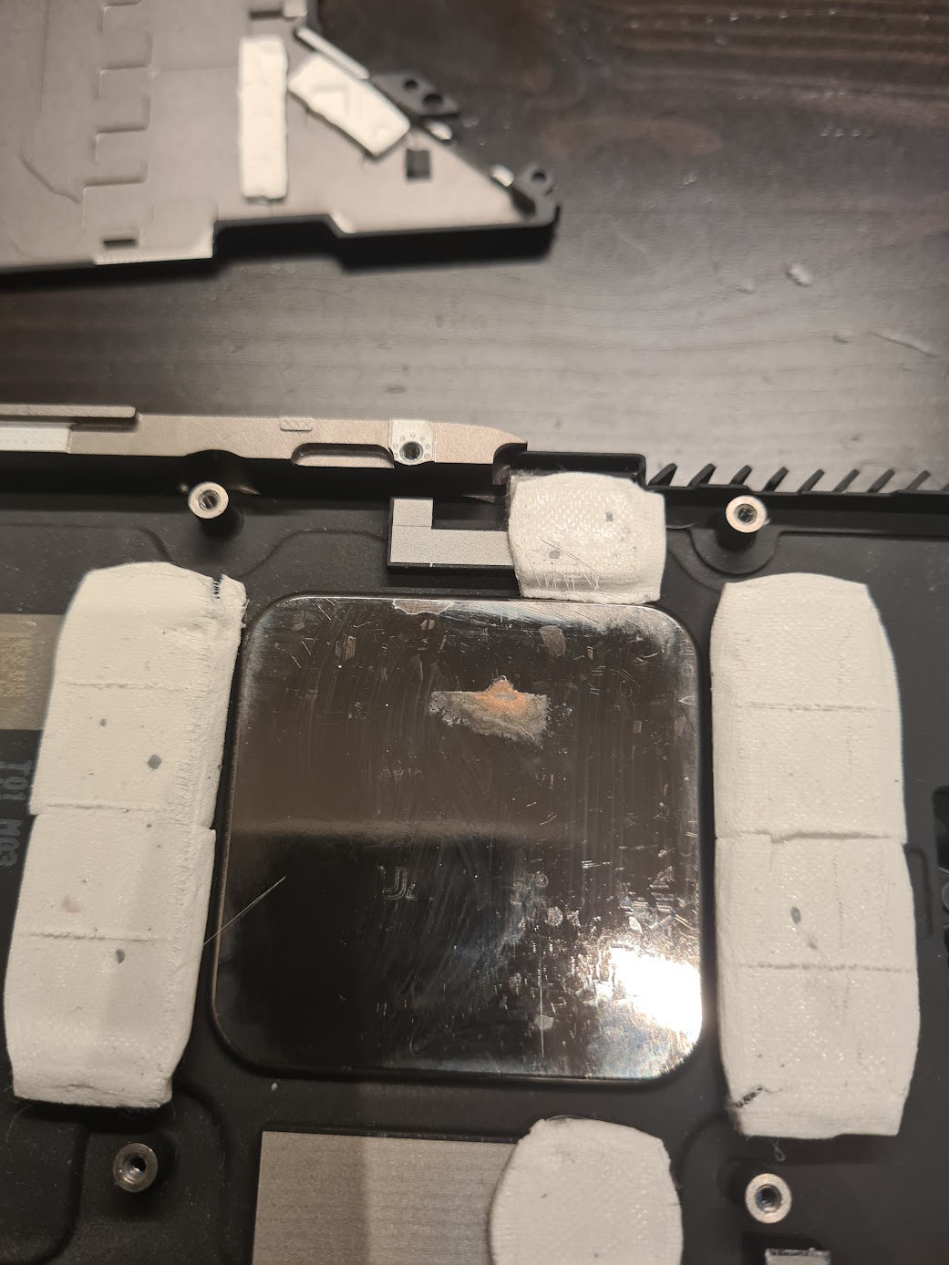 En inspectant le module thermique, j’ai constaté que le coldplate semble abîmé : un point de cuivre est apparent et l’irrégularité se sent au toucher. J’en déduis que le coldplate aurait probablement besoin d’un lappage (mais ce n’est qu’une hypothèse de ma part).