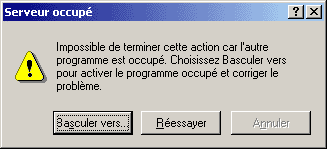 A quasiment chaque démarrage, XP affiche une fenêtre intitulé Serveur occupé, avec trois choix : Basculer vers, Réessayer et un dernier en grisé. quelque soit mon choix cette fenetre se réaffiche en 1 et 10 fois et je ne comprends pas l’origine du problème.