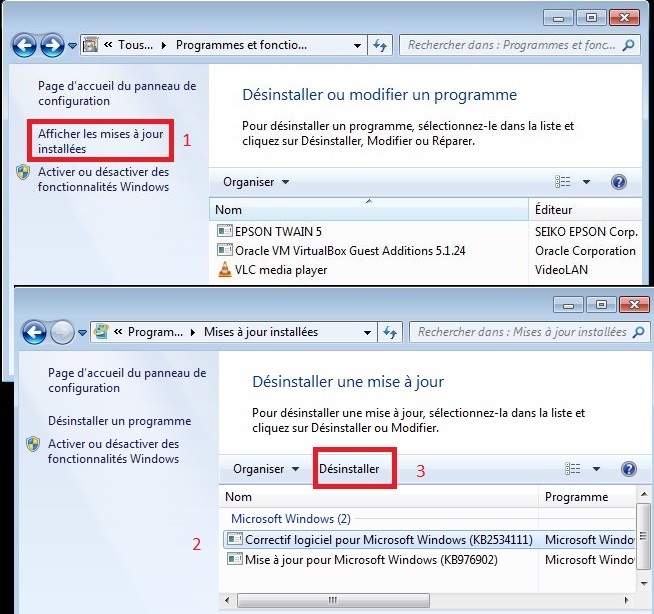 2 je pense que tu devrais suivre Option 3 : Désinstallation de la mise à jour de sécurité 2823324 à une invite de commandes du tuto microsoft support.microsoft.com… en te rappelant que toi c’est la KB4056894 que tu veux virer (certain site parle de la ligne Package_for_RollupFix~31bf3856ad364e35~amd64~~7601.24002.1.4 )