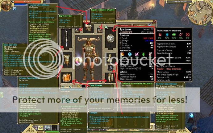 Il n’y a que les avants-bras que je n’ai pas mis (ils sont rangés au chaud dans mon coffre), j’ai préféré mettre à la place les Menottes de Créature Pétrifiante (trouvées sur une Gorgone verte), moins intéressantes en terme de bonus généraux mais qui offrent un superbe « +1 à TOUTES les compétences »