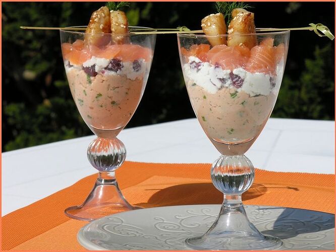 Verrine aux deux saumons, saint-jacques et fromage de chèvre frais