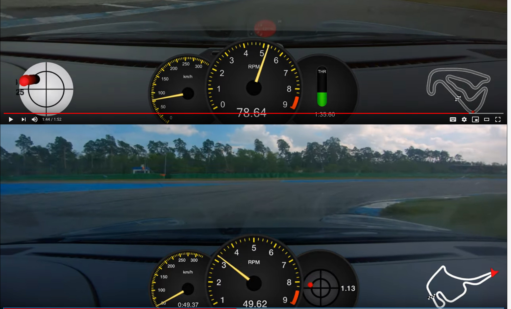Sur circuit, on peut aussi afficher le temps de chaque tour et ce gendre de données. Et en achetant leur boîtier OBD2, on peut également afficher les rapports de vitesse, la pression sur les pédales d’accélérateur et de frein, le régime moteur etc.