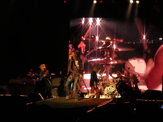 Alors Aero, j’avais peur. Des derniers albums en demi-teinte, un très bon groupe de hard mais un peu sur le retour. Pourvu qu’on fasse un saut dans les 70’s ! Ben ils l’ont fait. Y’avait une bonne partie de ce que je voulais entendre : Love In An Elevator, Eat The Rich, Rag Doll, Same Old Song And Dance, Draw The Line, Cryin’, Dream On, Sweet Emotion, Walk This Way… Bon ils ont oublié Mama Kin mais j’ai pris un gros kiff ! J’avais une voix de crooner en rentrant tellement j’ai gueulé. Ben oui, j’essayais de me faire entendre dans le micro quand Steven le tendait à la foule. On était grave bien placé, sur l’avancée de la scène. Steven et Joe ont passé une bonne partie du concert à 3m de nous. Notamment le début de Hangman’s Jury, sur des chaises, tranquille avant d’enchainer sur Seasons Of Wither. Il nous a tapé un bon vieux rot à la fin de Eat The Rich : c’est bien lui qui le fait sur l’album, il était exactement pareil, on aurait dit du playback ! Bref, super show à l’américaine, bien repété, avec big projo vidéo, guirlandes, ventilos dans les cheveux, confettis dans les grattes… Pas un pet’ de graisse sur Joe Perry qui doit faire des UV toute l’année, Steven Tyler plutôt en forme (moins que y’a 10 ans mais pas mal pour son âge), super performer toujours dans des positions et avec des fringues « chelous », un tatouage « lick me » sur le bide. 1h30 de live sans temps mort ou presque, quelques creux pendant les titres des derniers albums mais un bon vieux rock à l’ancienne avec Joe au chant et un peu d’impro (qui ne devait pas être improvisée en fait :D). Bref, content d’avoir vu ce groupe mythique !