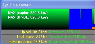 J’ai installé ma LB cet aprem une inventel (dommage pour l’info de derniere minute c’est une "classic" enfin c’est pas bien grave le debitmax1 c’est deja presque trop ) donc installation sans soucis, il me manquais juste la bonne vieille palette de transfer d’adsl autoconnect… J’ai donc installé un pti soft (Eye on network) qui dispose ma foi d’une fort belle palette de transfer Et la que vois-je 5.5 en UP 4.7 en DL sans aucune activité sur le net. Est-ce le reseau local qui provoque cette activité sur ma belle palette ??