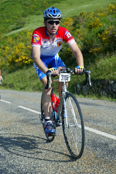Premier col : col de Port. N’étant pas excellent grimpeur, je laisse filer mon collègue et monte à mon rythme, en gardant mon coeur entre 165 et 170 puls. Déjà, beaucoup de dégâts…sans doute ceux qui ne ce sont pas échauffés. Je fais quasiment toute la montée en 38x28 ou 38x25 (pourcentages variant de 9 à 6%) et je remonte environ 800 cyclos. J’avais reconnu ce col Dimanche dernier et je savais que les 3 derniers kilomètres étaient faciles (4.5%). A l’arrivée des 3 derniers kms, je passe en 38x19, en forcant un peu plus…mais je double pas mal de monde. Sur les 500 derniers mètres, je passe en 53x19 !