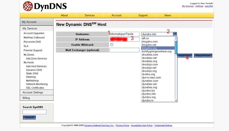 Dans notre exemple le nom d’hôte est donc informatique-facile.dyndns.og