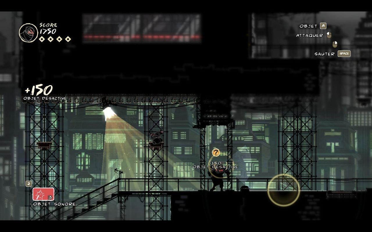 Il faudra donc ruser. Heureusement, qui dit ninja dit panoplie de gadgets divers et variés, et acrobaties à en faire pâlir un Ezzio Altaïr Kenway. Comme un ersatz de Spider-Man, notre p’tit gars est capable de grimper sur 90% des murs, voire des plafonds, pour mieux surprendre ses proies. Il peut également se cacher derrière des éléments du décor, pots de fleurs, statues, portes, etc… pour passer inaperçu et éviter les rondes. Il dispose également rapidement (dès le premier niveau) d’un grappin pour accéder à certains endroits en hauteur, et de fléchettes de bambou, non létales mais qui lui permettront de casser les lampes ou systèmes de sécurités, voire attirer l’attention d’un garde (se prendre une fléchette dans le cul, ça se remarque ^^ ).