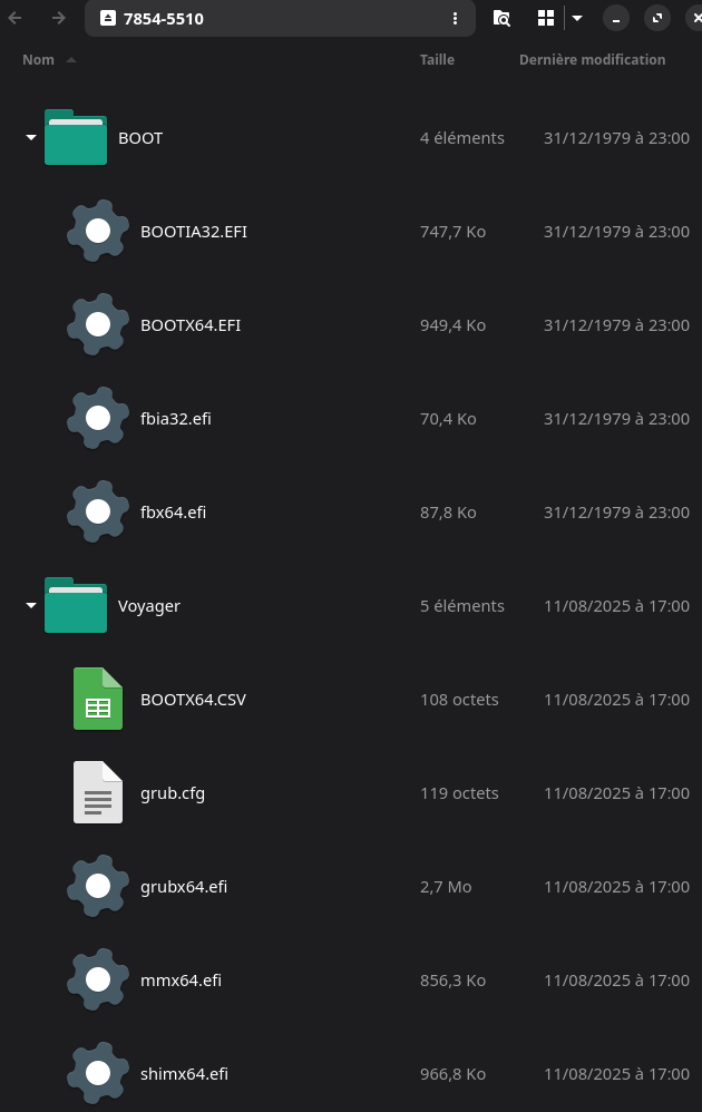 Cela marche mais il y a un truc, je pense qu’en fait cela fait un billard à 3 bandes → boot efi dans le disque samsung (car cela s’appelle encore ubuntu )-> passe dans le boot/efi donné par fstab, donc dans mon boot efi customisé ou grub2 est configuré pour dire « voyager » et plus « ubuntu »