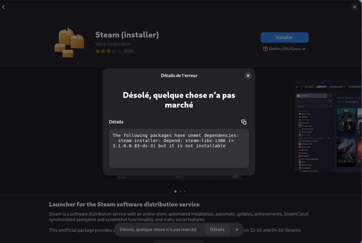 Certaine distribs ne mettent plus les dépots des paquets 32bits, mais ici me semble que j’ai simplement fait un apt update, apt search steam pour le trouver et apt install (de celui trouver par search) dans le terminal