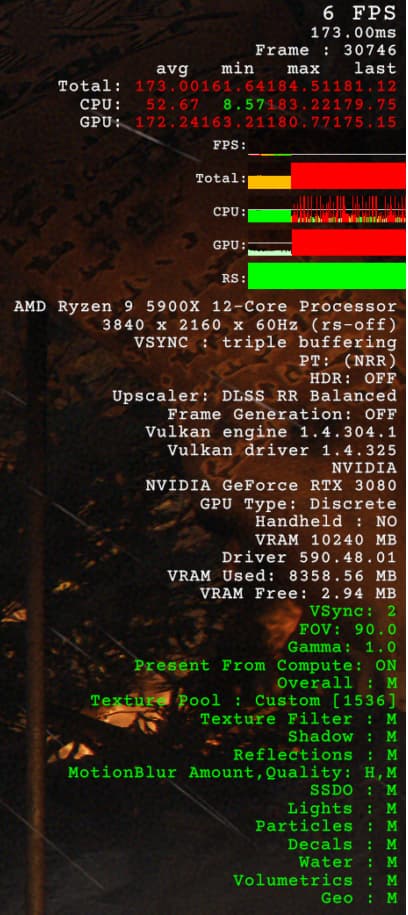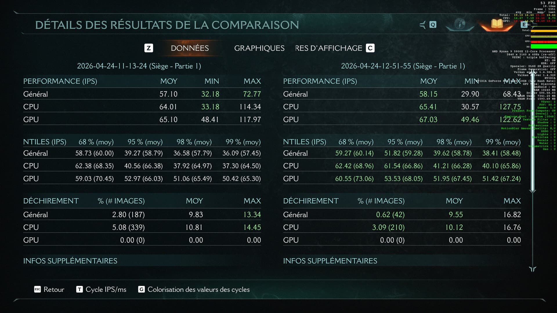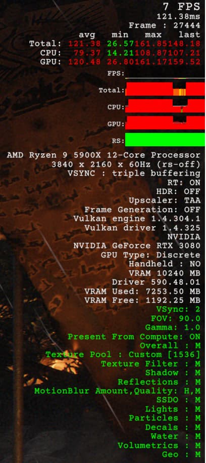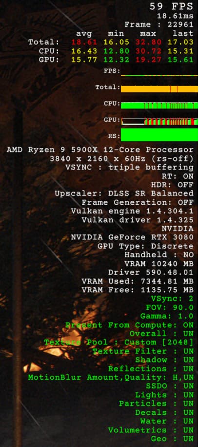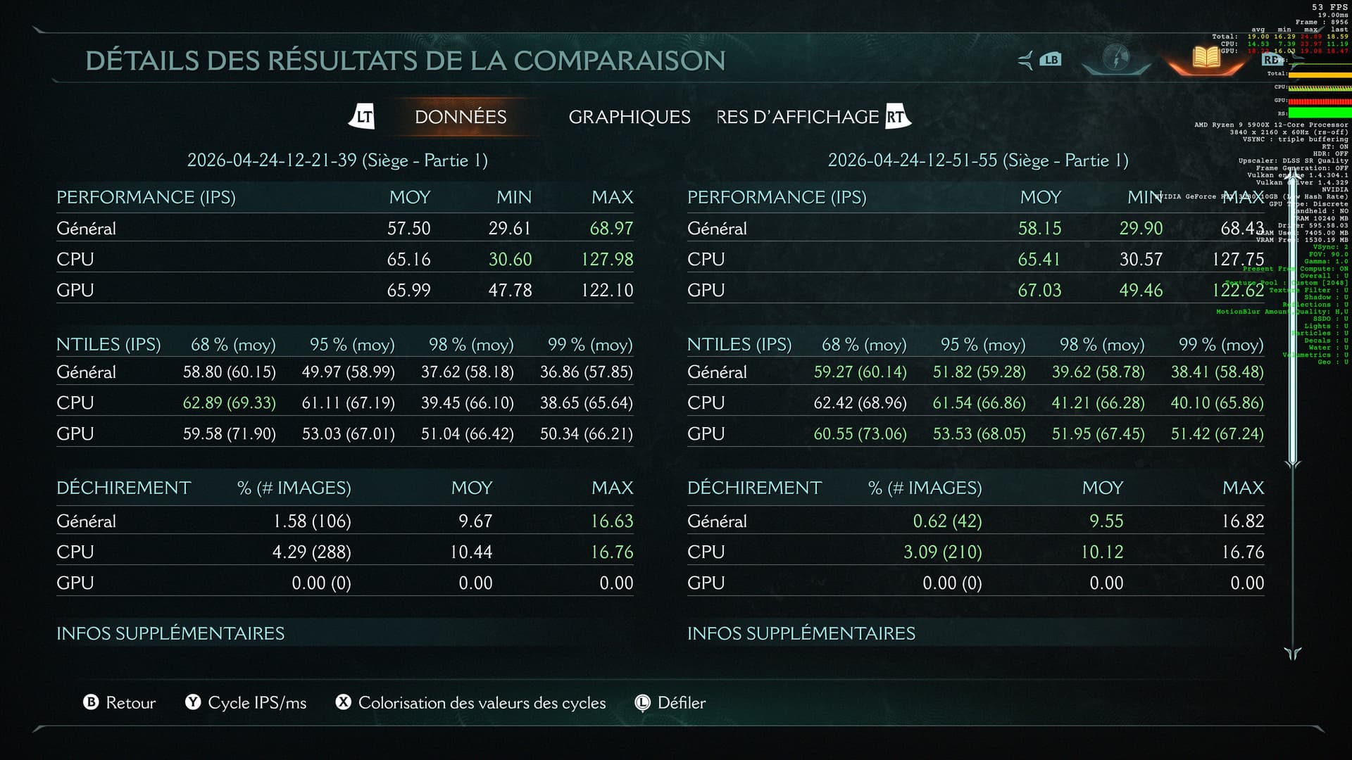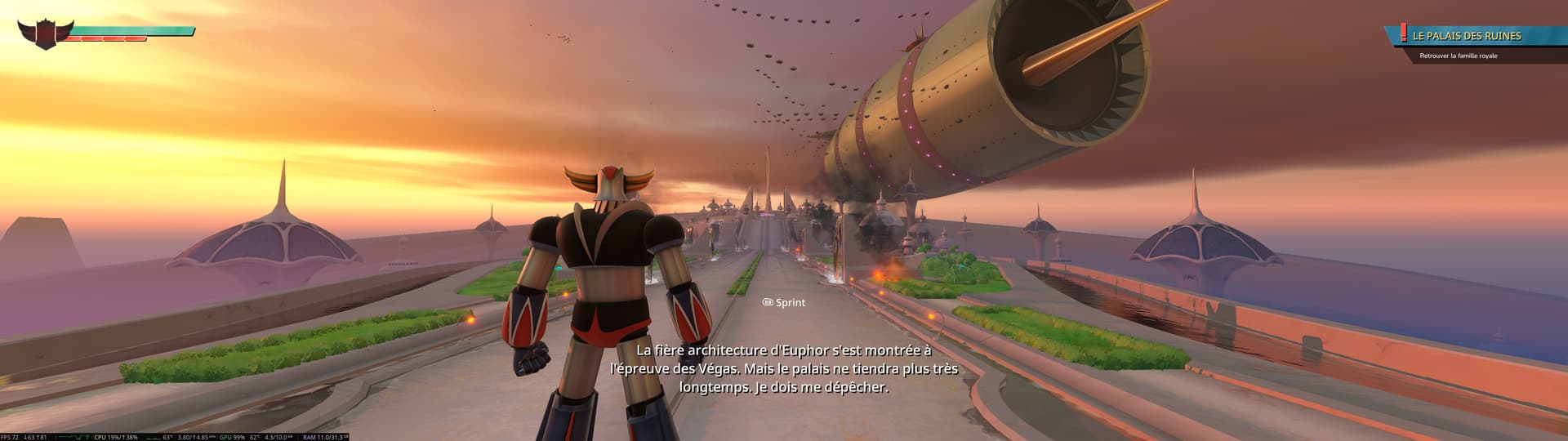 Ras coté lancement, perf assez stable vers 60FPS (en 4K cette fois-ci et avec synchro verticale,d’où le 60) avec un gpu qui monte > 90 d’usage quand même, malgré des graphismes + de 2015 que de 2021 à mon avis