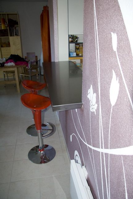 Et enfin, on a refait la planche du bar. Comme vous pouvez le voir sur la première photo, c’est du bois brut, pas très joli.