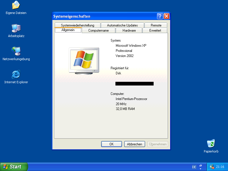 windows xp pro sur un pentium 20mhz et 32mb de ram si si ca existe :lol: